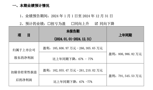 1月24日晚间,重庆智飞生物制品股份有限公司(以下简称“智飞生物”或“公司”)2024年度业绩预告。公司预计2024年度归属于上市公司股东的净利润为185,606.97万元至266,305.65万元,同比下降67%至77%。扣除非经常性损益后的净利润预计为182,055.47万元至261,210.02万元,亦同比下降67%至77%。