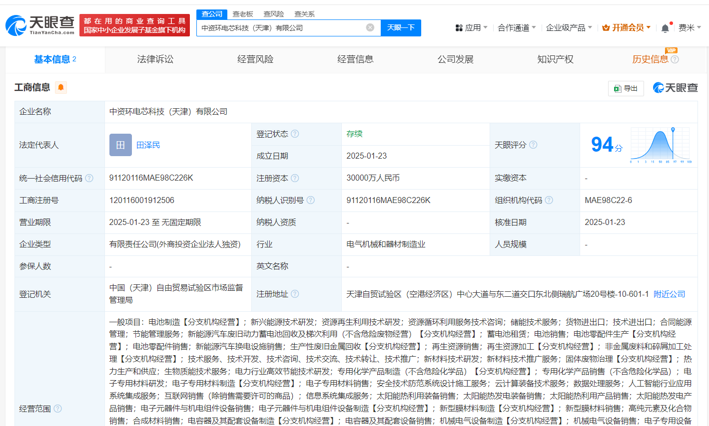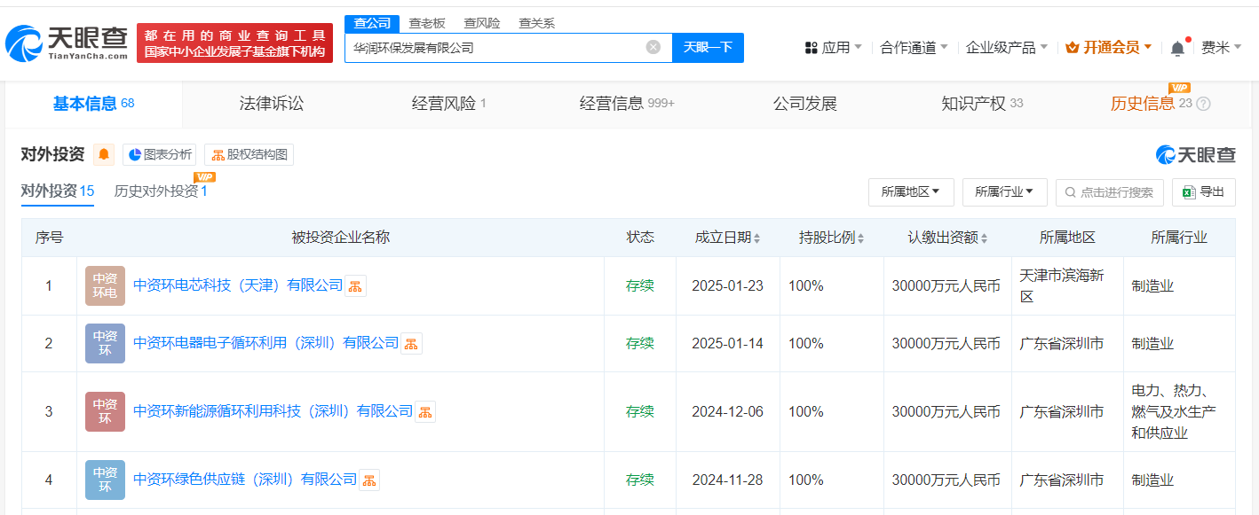 每经AI快讯,天眼查App显示,近日,中资环电芯科技(天津)有限公司成立,法定代表人为田泽民,注册资本3亿元人民币,经营范围含电池制造、新兴能源技术研发、资源再生利用技术研发、资源循环利用服务技术咨询、储能技术服务、合同能源管理等,由华润环保发展有限公司全资持股。值得一提的是,近期,华润环保发展有限公司已成立了中资环绿色供应链(深圳)有限公司、中资环新能源循环利用科技(深圳)有限公司、中资环电器电子循环利用(深圳)有限公司。